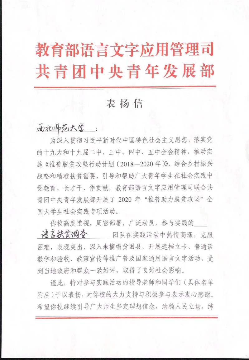 近日,教育部语言文字应用管理司、共青团中央青年发展部向学校发来表扬信,感谢16877太阳集团路线检测语言扶贫调查实践团在2020年“推普脱贫攻坚”全国大学生暑期社会实践专项活动作出的贡献。