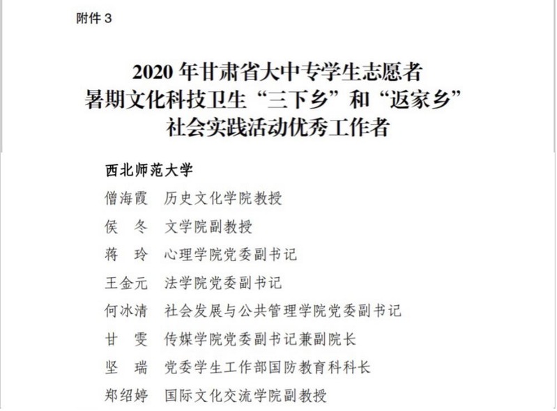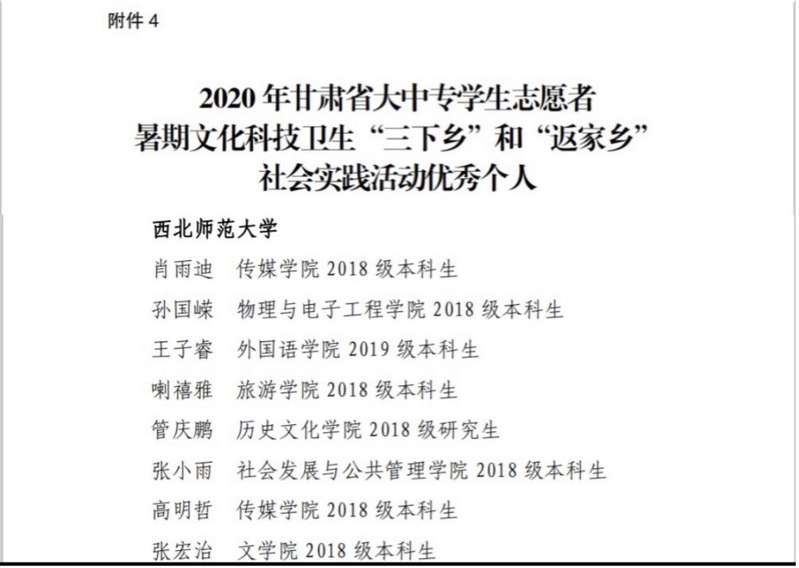 在此次评选中,我校多个单位、多名师生荣获表彰。我院党委副书记、副院长甘雯获“优秀工作者”荣誉称号,2018级本科生肖雨迪、高明哲获“优秀个人”荣誉称号。这是上级单位对我院2020年社会实践工作的又一次肯定。
