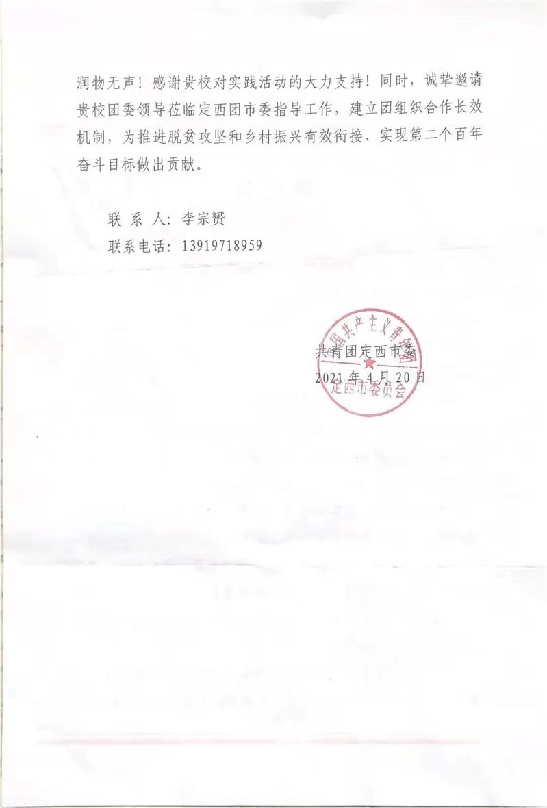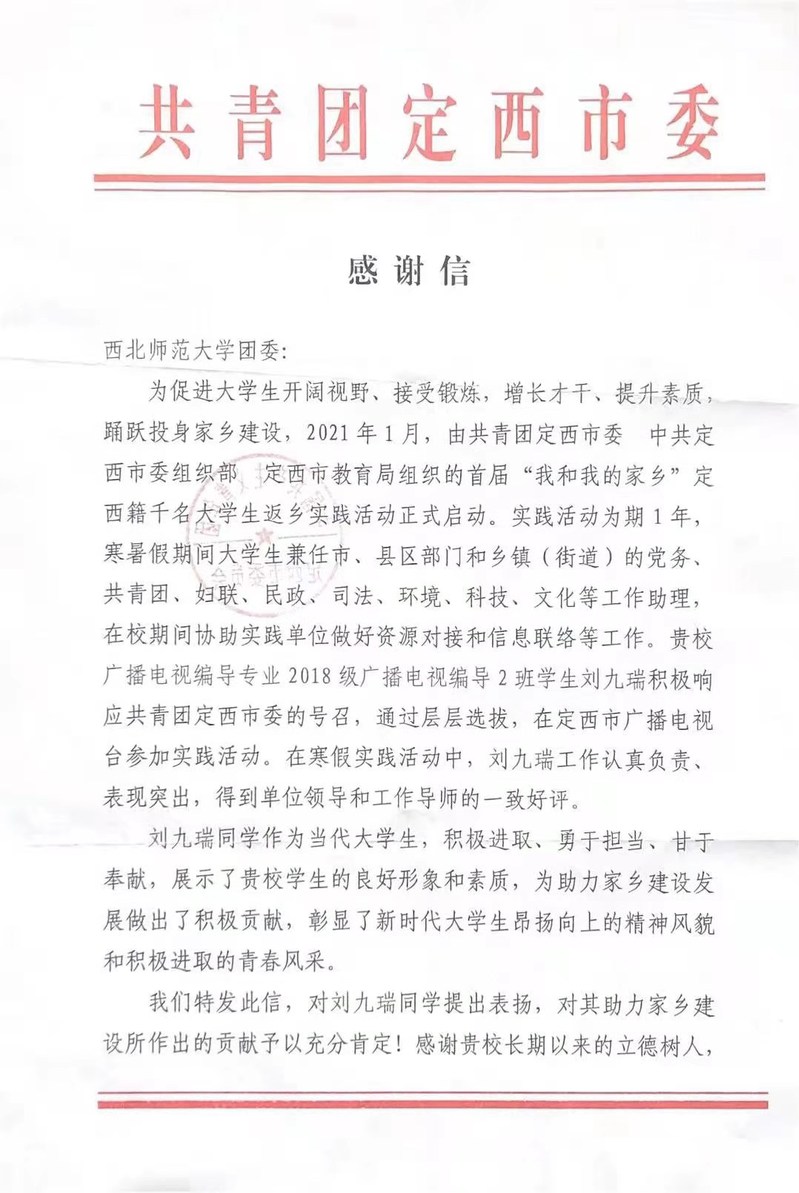 我院学生刘九瑞受共青团定西市委来信表彰