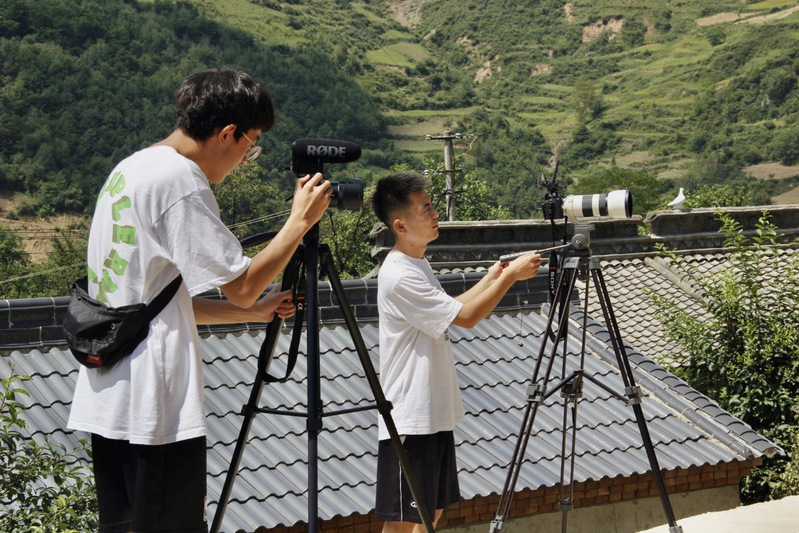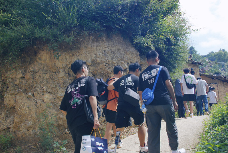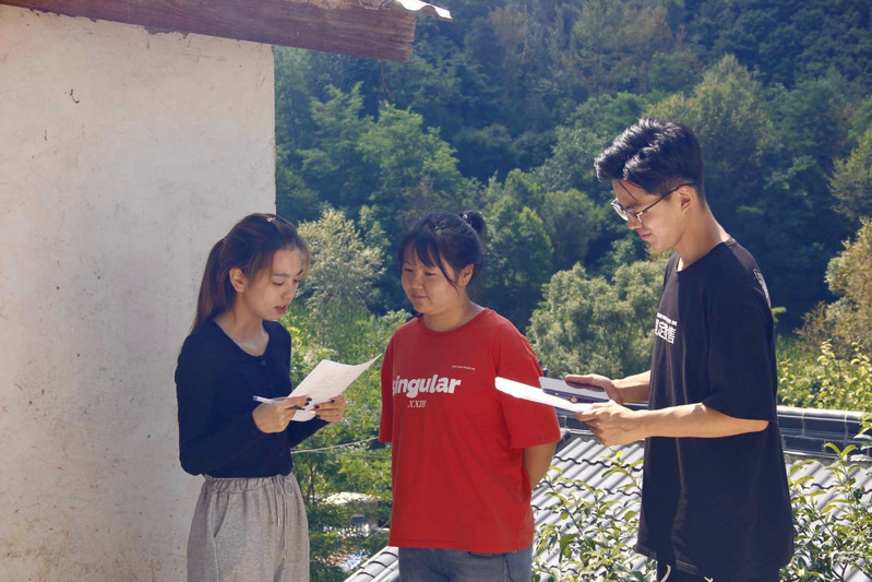 图为实践队员沿山路挨家挨户走访村民。这个季节,多数村民都在田间地头忙农活、晾晒麦子,家中有可采访对象的并不多。