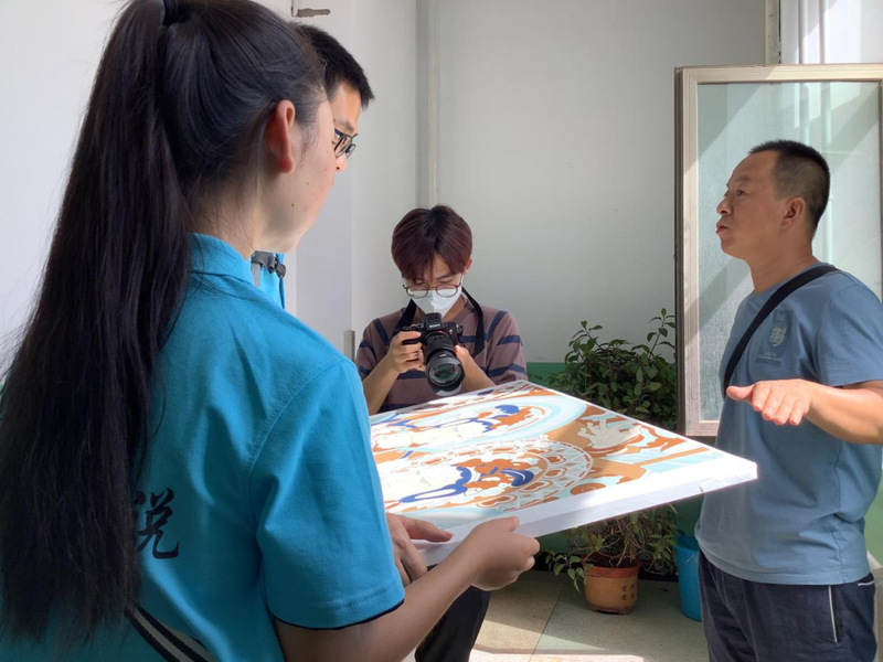 随后,团队成员观摩张万宁老师的矿石颜料画作,并在张老师的带领下近距离地观赏、触摸画作。阳光照射下的画作,矿石颜料闪着独有的光芒。