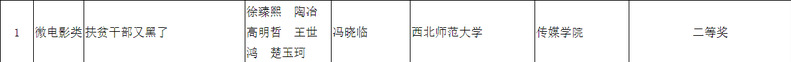 其中徐臻熙、陶冶、高明哲、王世鸿、楚玉珂创作的《扶贫干部又黑了》 荣获微电影类作品二等奖,指导教师为冯晓临。