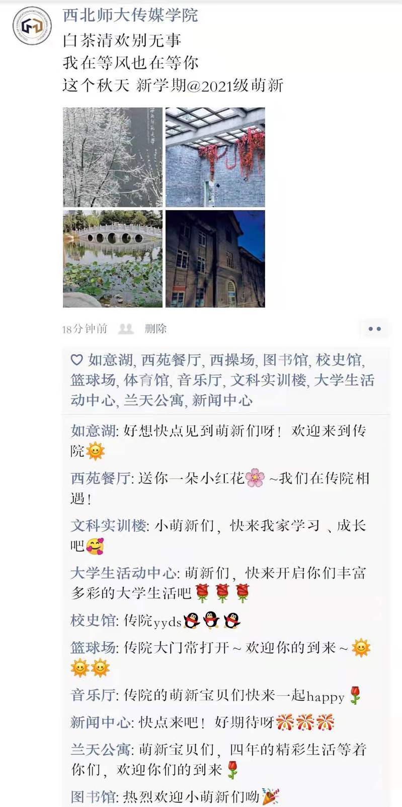 2021级广播电视编导3班刘芫君:“很高兴能在21年的九月走进西北师大的大门,我想在大学里,除了认真学习以外,还要加强自身的身体素质和社会责任感。在中学时期,为了高考而努力奋斗的日子,都是记忆中闪着光芒的影像,步入大学,我也会认真思考自己想要的究竟是什么,我该如何去实现它。有目标的努力会让大学的生活更加丰富和轻松。”