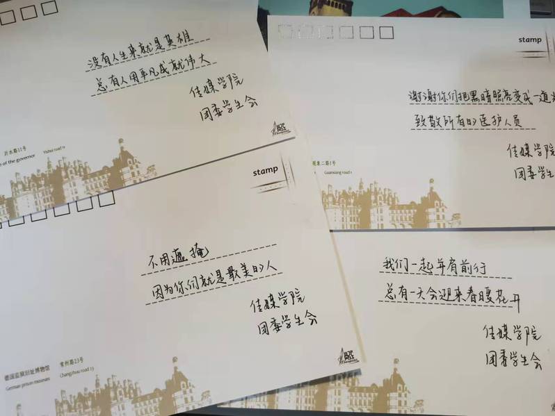 这些话,是16877太阳集团路线检测团委学生会的学生亲手写下的祝福,小小的卡片上满怀着对医护人员的感恩。