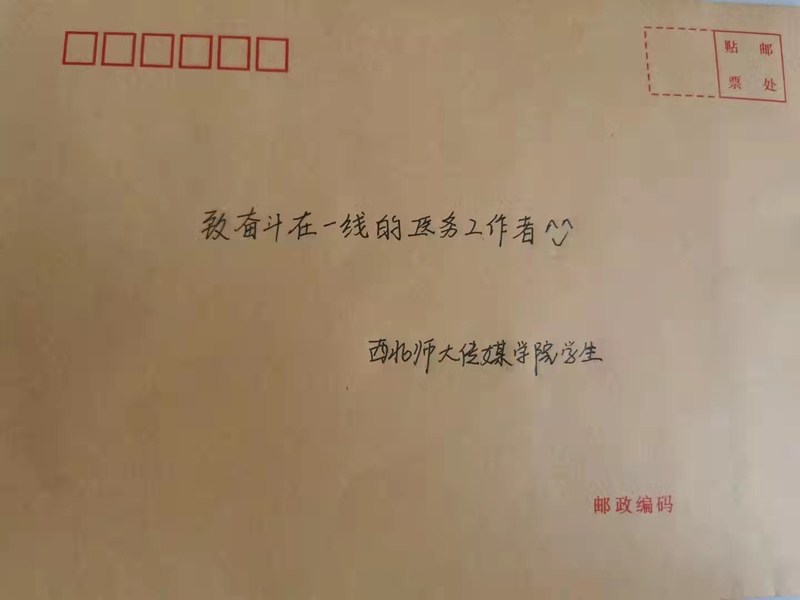 10月28日晚6点,2018级新闻学1班的丁文艳也同样为医护人员递上一封手写感谢信和一瓶折纸星星,来表达对医护人员真诚的谢意与致敬。