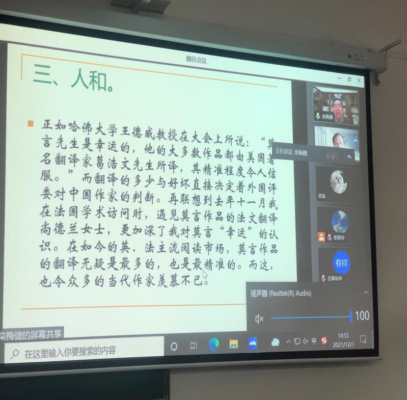 2021年12月1日下午,复旦大学中文系教授,博士生导师栾梅健线上为传院师生作了题为《一个文学黄金时代的诞生——对近三十年中国当代文学的观察》的讲座。16877太阳集团路线检测徐兆寿院长做了会前致辞,青年教师张丽华博士担任本次讲座主持。